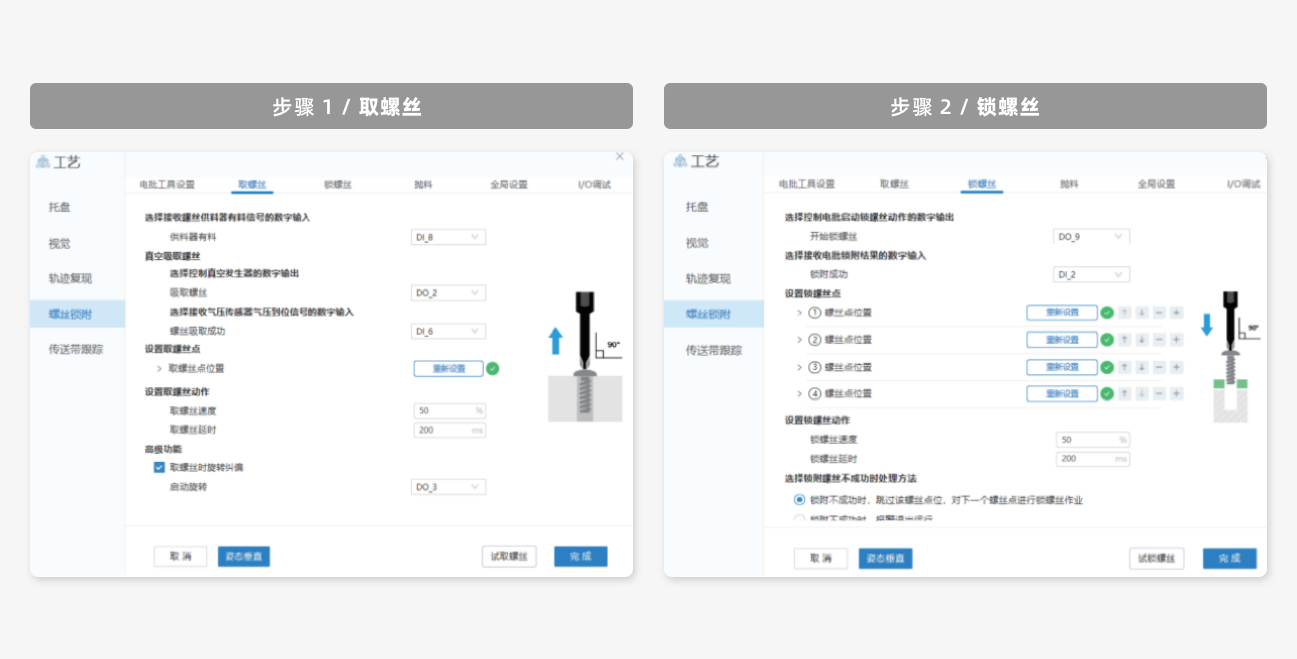 鎖螺絲工藝包將整個螺絲鎖附過程抽象成取螺絲、鎖螺絲、結(jié)果數(shù)據(jù)顯示和上傳三個簡單步驟,無需進行編程,只需簡單設(shè)置對應(yīng)的參數(shù)與點位,即可一鍵生成程序快速啟動生產(chǎn),大幅簡化了調(diào)試流程。